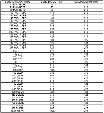 Paslanmaz çelik tamir kelepçeleri, 32- 1500mm arasında üretilmekte olup, Çelik, Düktil, CTP, PVC ve PE 100 boruların tamirinde kullanılabilirler. Özellikle O-Ring Contalı Çelik Tamir Kelepçeleri, PE 100 ve U-PVC basınçlı hat borularının tamirinde sıklıkla tercih edilirler. Gövde sacının uçları 3 mm kıvrık olup, bu işlem contanın yüksek basınç altında gövde sacından taşmasını engellemektedir ve gövdenin daha mukavemetli olmasını sağlamaktadır. AISI 304 ve AISI 316L ham maddeleri kullanılarak üretimleri yapılmaktadır. Conta kısmı EPDM olup, (-20°;+90°) Su, Atık Su, Asit, Katı Kimyasal Ürünlerinde kullanılabilmektedir. Daha agresif sıcaklık değerleri ve diğer kimyasallar için NBR (-20° ;+90°) Su, Gaz, Yağ, ve Petrolle birlikte, VİTON (-30° ;+260°) Gaz, Yağ, Asit, Katı Kimyasal ve Petrol ile kullanılabilmektedir. Civatalar, AISI 303 Paslanmaz Çelik, AISI 304 Paslanmaz Çelik, AISI 316 L Paslanmaz Çelik ham madde kullanılarak üretilirler. Civatalar sarmaya karşı teflon kaplıdır. Somun ve pullar ise, AISI 304 Paslanmaz Çelik ve AISI 316 L Paslanmaz Çelik ham maddeleri kullanılarak üretilirler